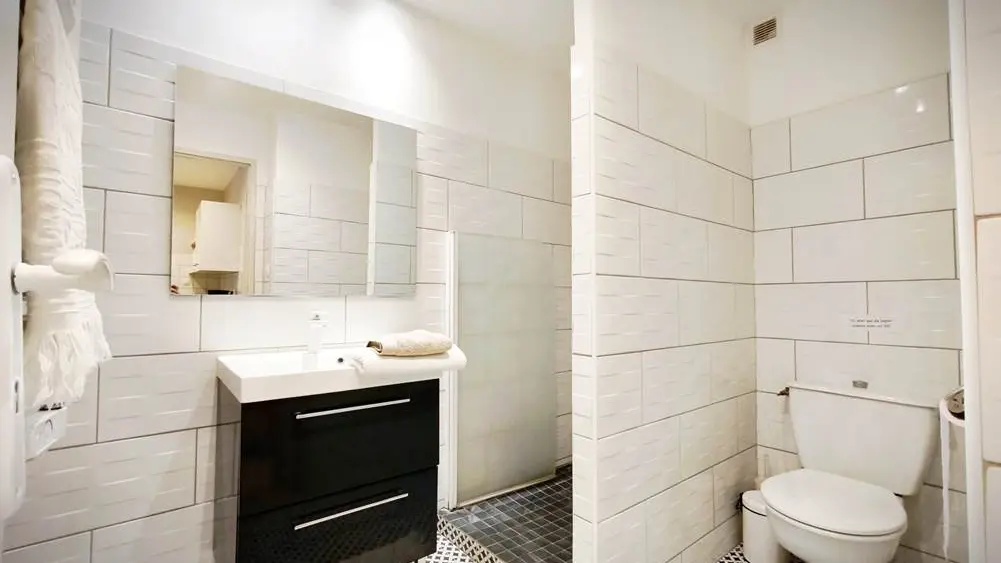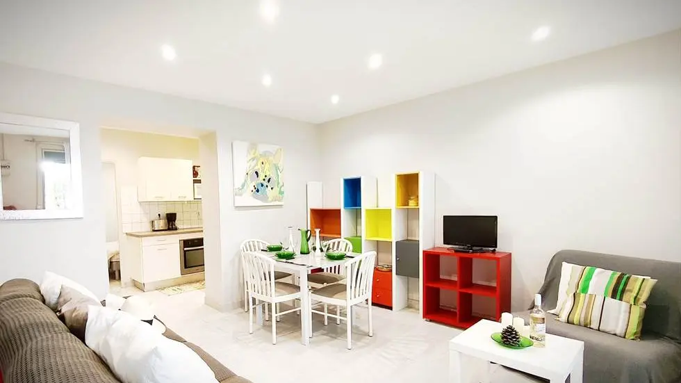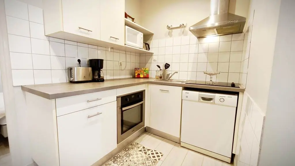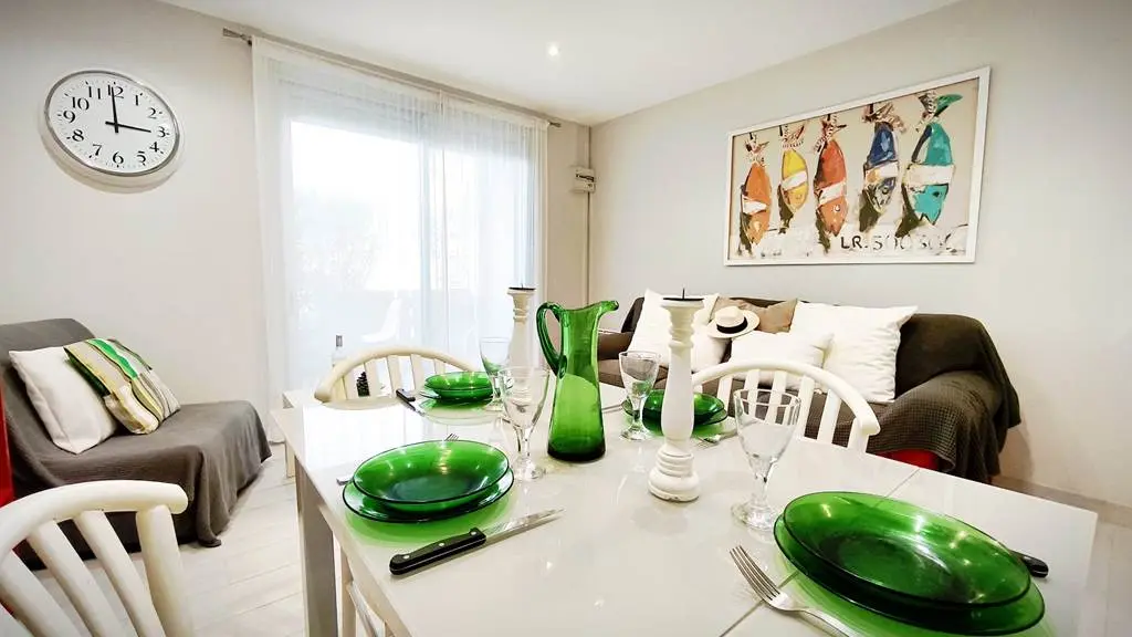 Le salon-salle à manger, baigné de lumière, s’ouvre sur une cuisine entièrement équipée. La chambre, quant à elle, reste agréablement fraîche grâce à une climatisation réversible. Une salle d’eau moderne ainsi que des toilettes complètent ce confortable appartement.